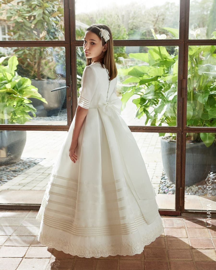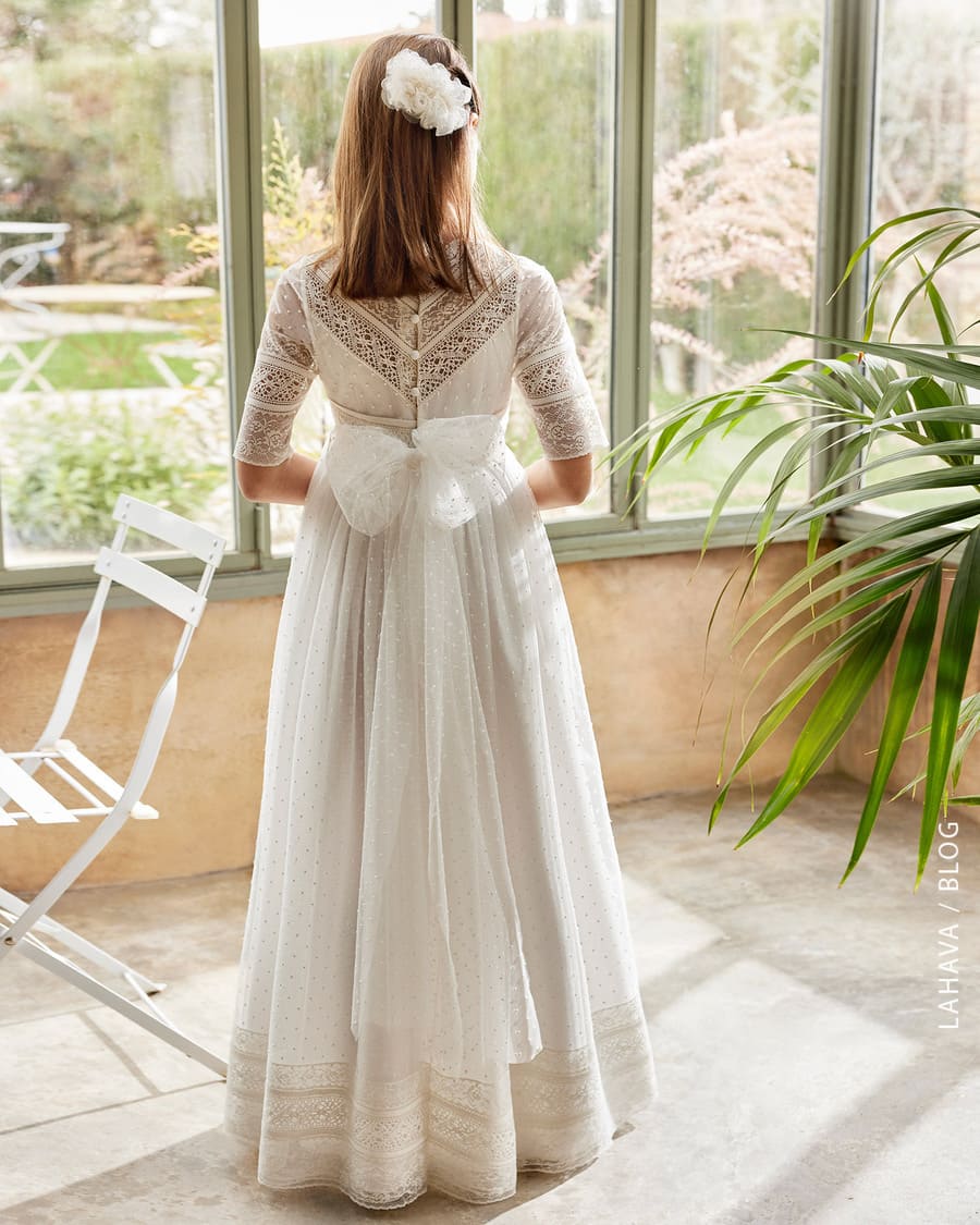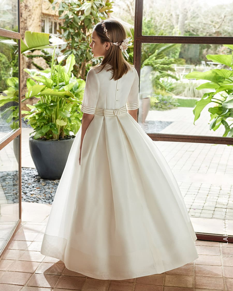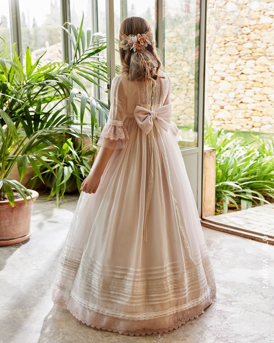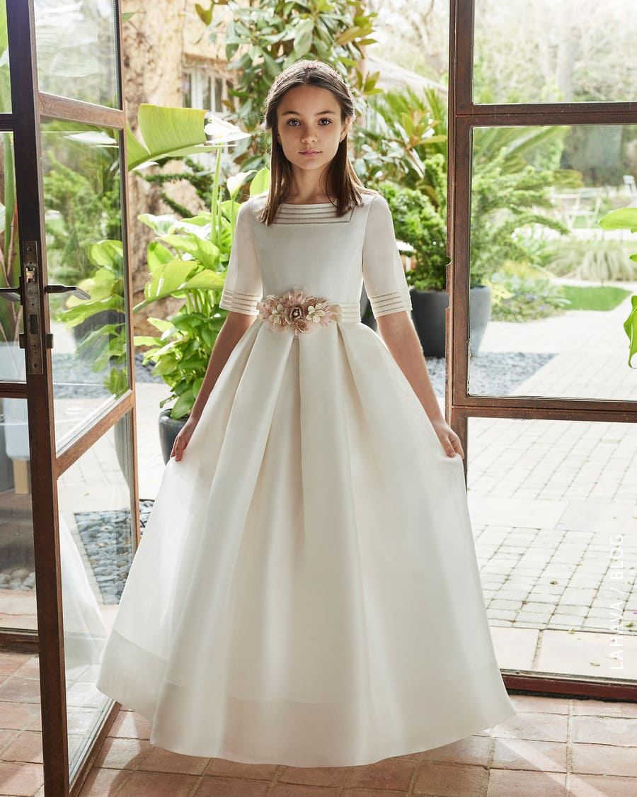 Váy công chúa cổ vuông bằng lụa đan giỏ mịn; với đường viền cổ vuông với chi tiết entredeux, tay áo ngắn; thắt lưng với họa tiết hoa và váy trơn.