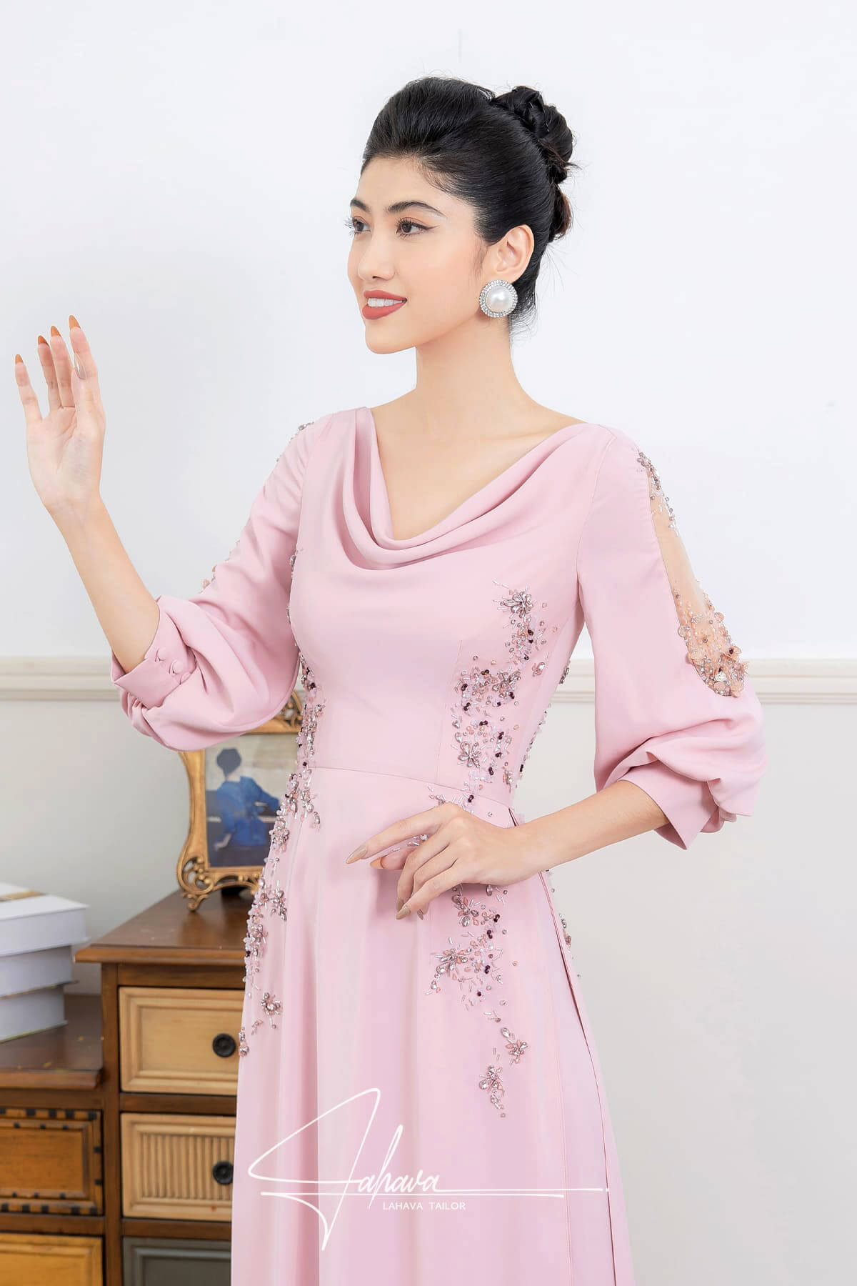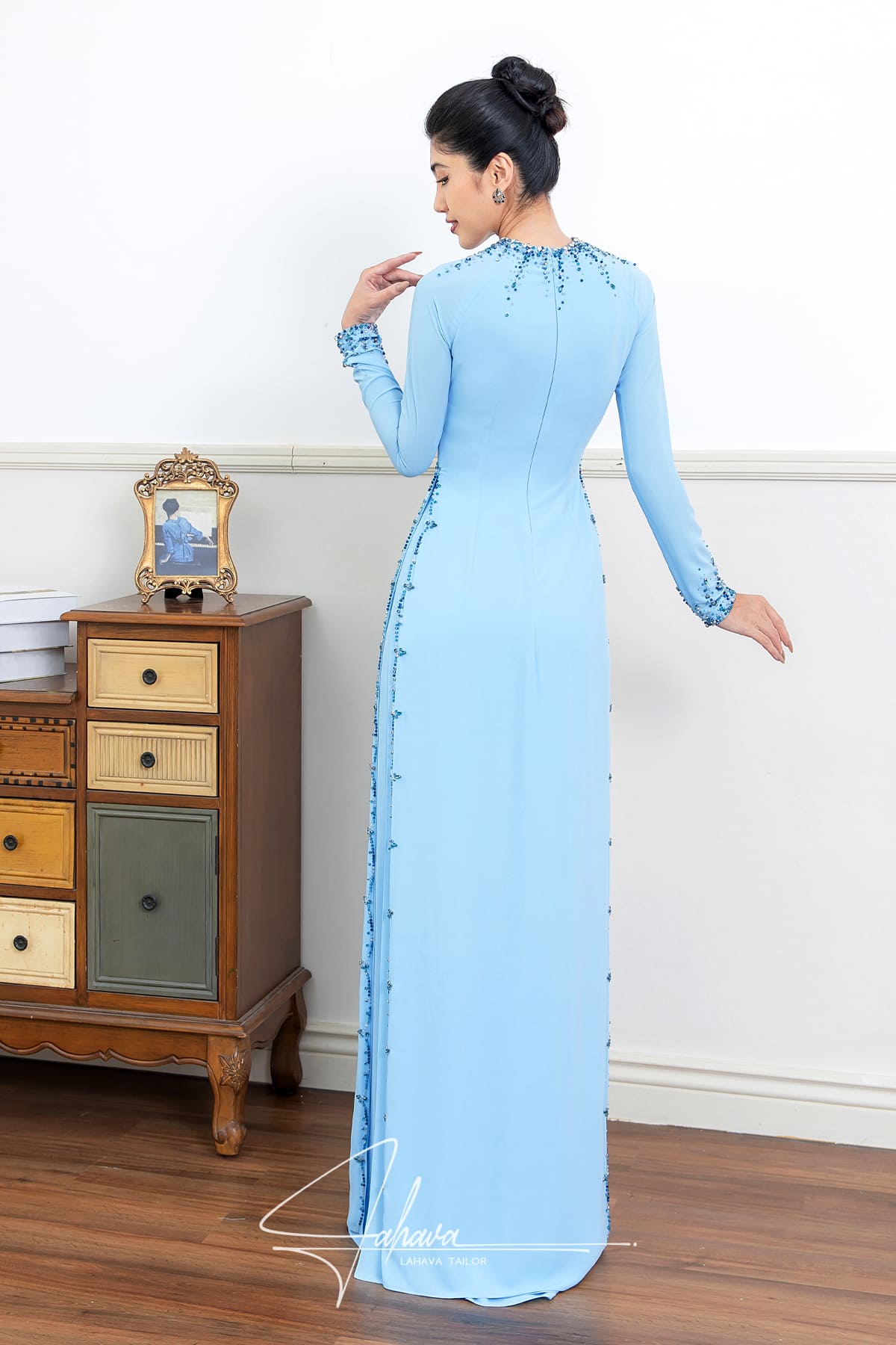 Nhẹ nhàng và tinh tế là cụm từ dùng để miêu tả về chiếc áo dài này, thiết kế thanh lịch với điểm nhấn cut-out dưới cổ và được trang trí bởi cườm đá cao cấp. Một thiết kế hợp với các sự kiện và lễ cưới.