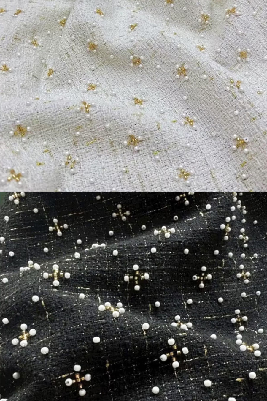 Sự kết hợp hoàn hảo giữa nét truyền thống của tà áo dài và vẻ hiện đại từ chất liệu vải tweed cao cấp. Điểm nhấn nổi bật là họa tiết hoa lá được đính kết thủ công tỉ mỉ bằng đá và cườm với tông màu xanh lục bảo và xanh navy sang trọng. Những hạt cườm nhỏ ánh vàng điểm xuyết khắp thân áo tạo nên vẻ đẹp quý phái, thanh lịch, rất phù hợp cho các dịp lễ tiệc cao cấp.