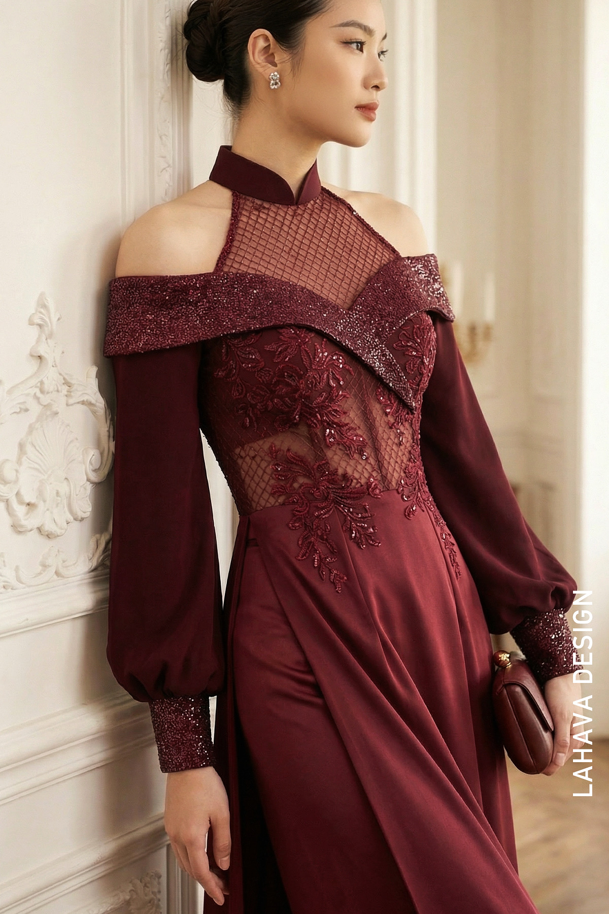 Mẫu thiết kế mang hơi thở hiện đại trên nền Áo Dài truyền thống. Với tông màu đỏ rượu (burgundy) sang trọng, chiếc áo nổi bật nhờ chi tiết trễ vai phối lưới độc đáo và tay áo bồng bo gấu đính kết cầu kỳ. Phần thân trên được trang trí hoa văn ren tinh xảo kết hợp cùng tà lụa mềm mại, tạo nên vẻ đẹp vừa quý phái, bí ẩn vừa gợi cảm cho người mặc.