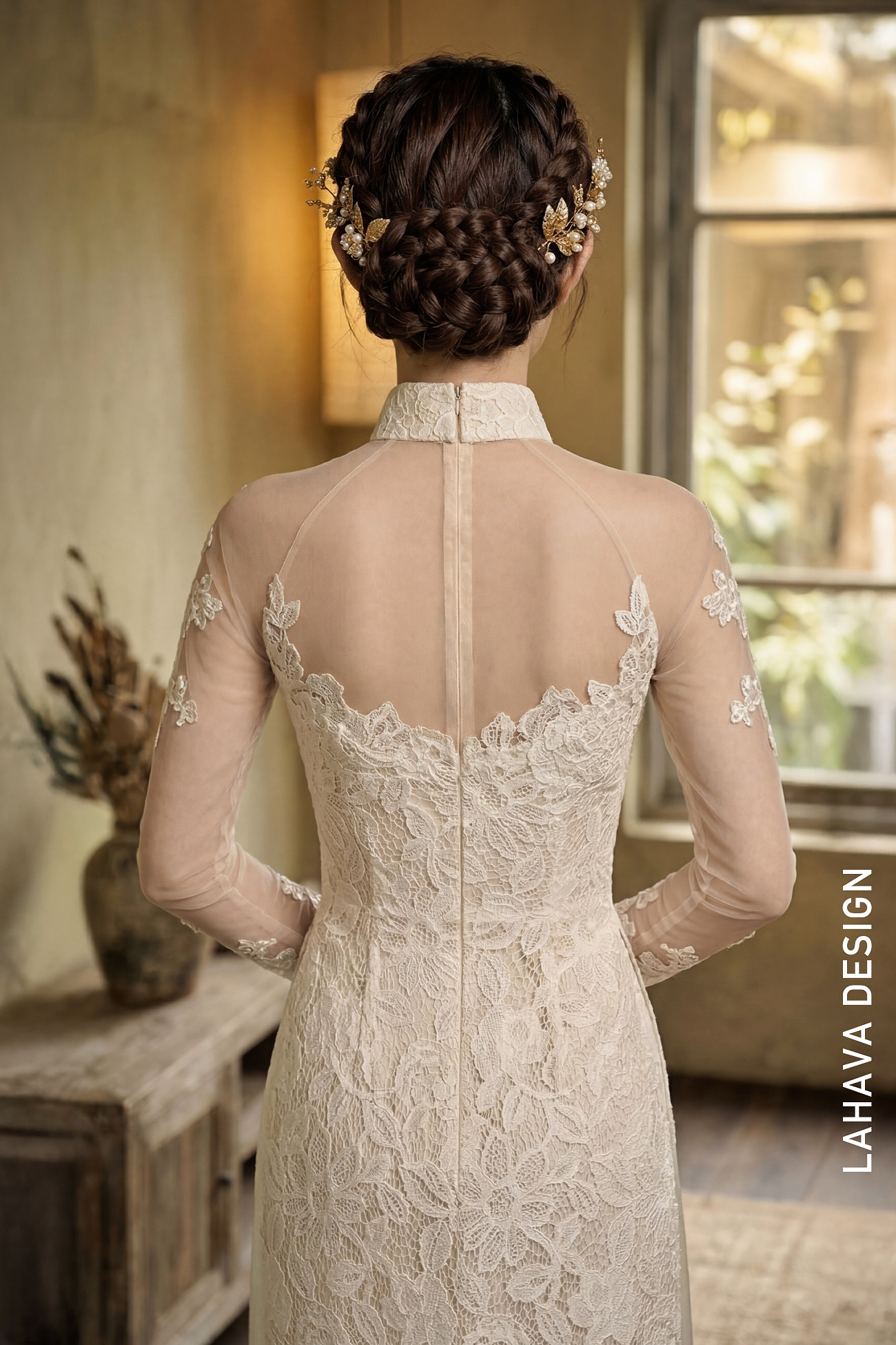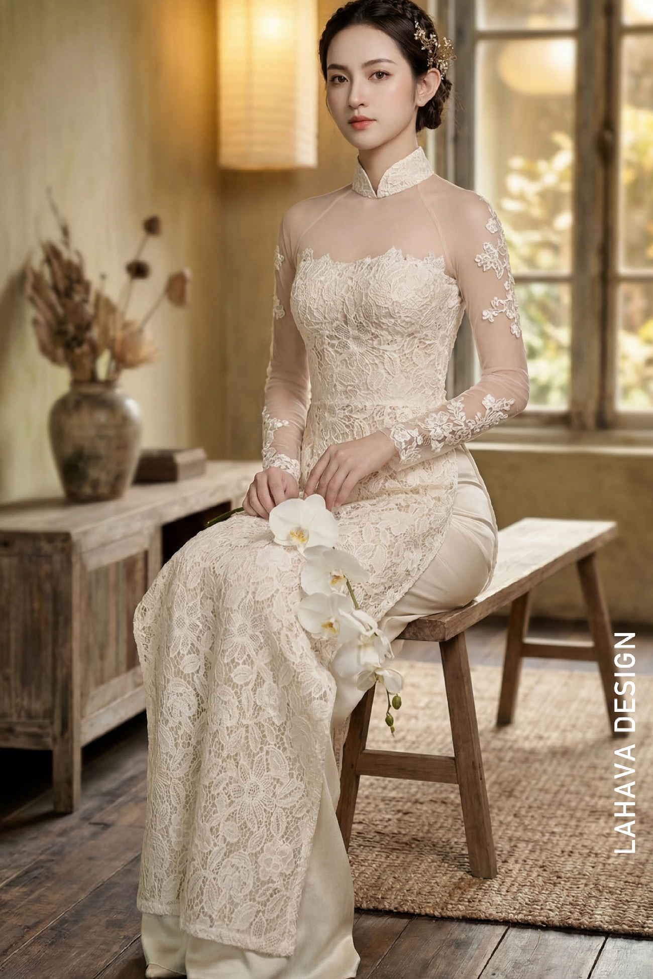 Mẫu áo dài mang vẻ đẹp vượt thời gian với chất liệu ren hoa cao cấp được phủ toàn thân một cách tinh xảo. Thiết kế kết hợp hài hòa giữa cổ cao truyền thống và phần phối lưới xuyên thấu ở ngực và tay, tạo nên hiệu ứng ẩn hiện đầy gợi cảm nhưng vẫn giữ trọn nét thanh lịch. Đây là lựa chọn hoàn hảo cho những quý cô yêu thích sự kết hợp giữa nét cổ điển và hơi thở hiện đại.