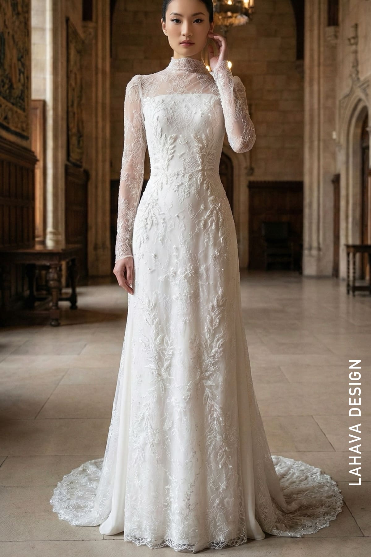 Chiếc áo dài cưới này là sự kết hợp hoàn hảo giữa nét truyền thống và hơi thở hiện đại, mang đến vẻ đẹp thanh lịch và tinh khôi cho cô dâu trong ngày trọng đại. Thiết kế cổ cao cách tân kín đáo nhưng không kém phần sang trọng, cùng với tay áo dài ren tinh xảo, tôn lên vẻ đẹp dịu dàng và quý phái. Họa tiết thêu hoặc đính kết tinh tế trên nền vải trắng cao cấp tạo điểm nhấn ấn tượng, thể hiện sự tỉ mỉ và đẳng cấp trong từng chi tiết. Dáng áo suông nhẹ nhàng, uyển chuyển ôm lấy đường cong cơ thể, giúp cô dâu tự tin tỏa sáng. Đây là lựa chọn lý tưởng cho những ai tìm kiếm sự duyên dáng, lãng mạn và độc đáo cho ngày cưới của mình.