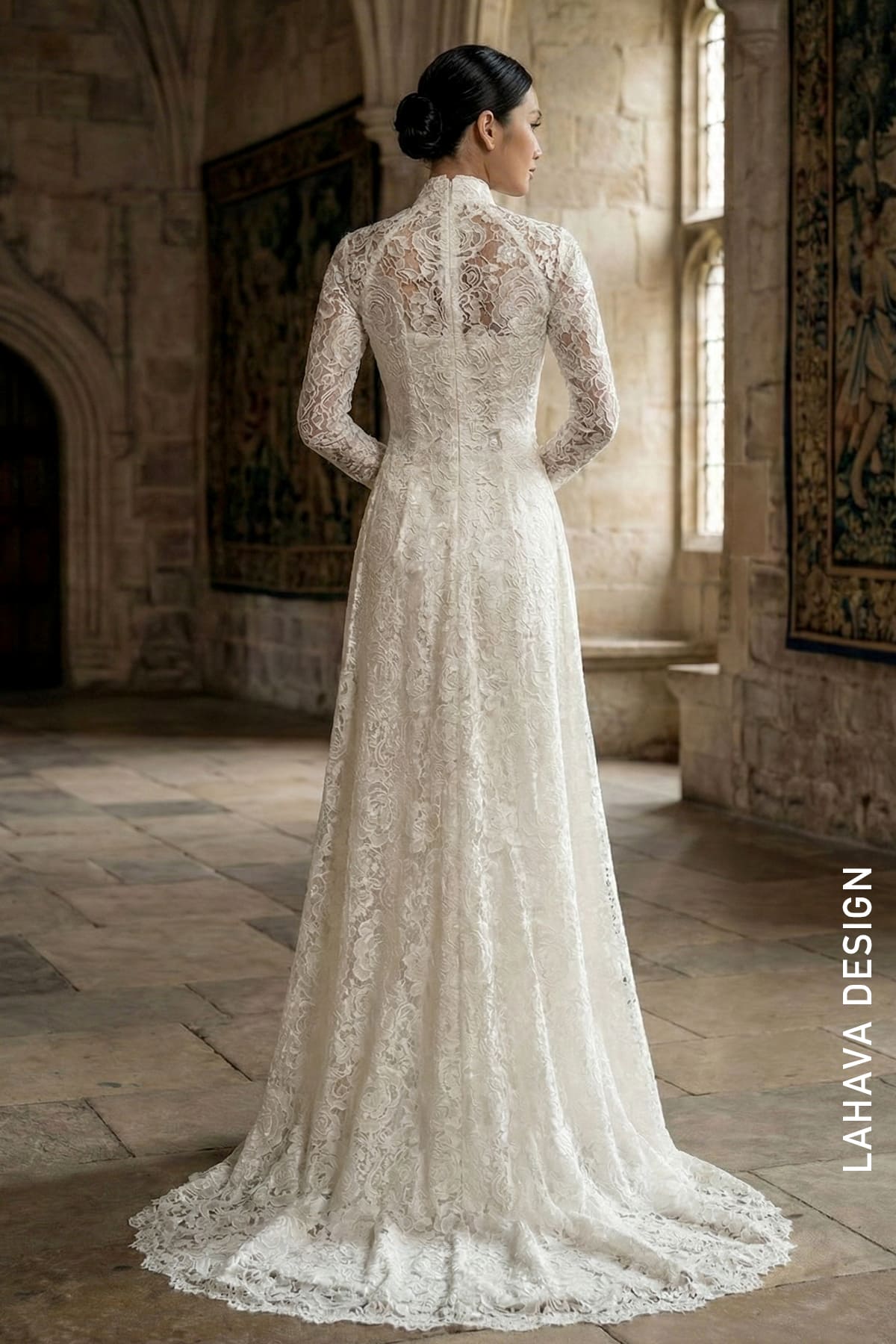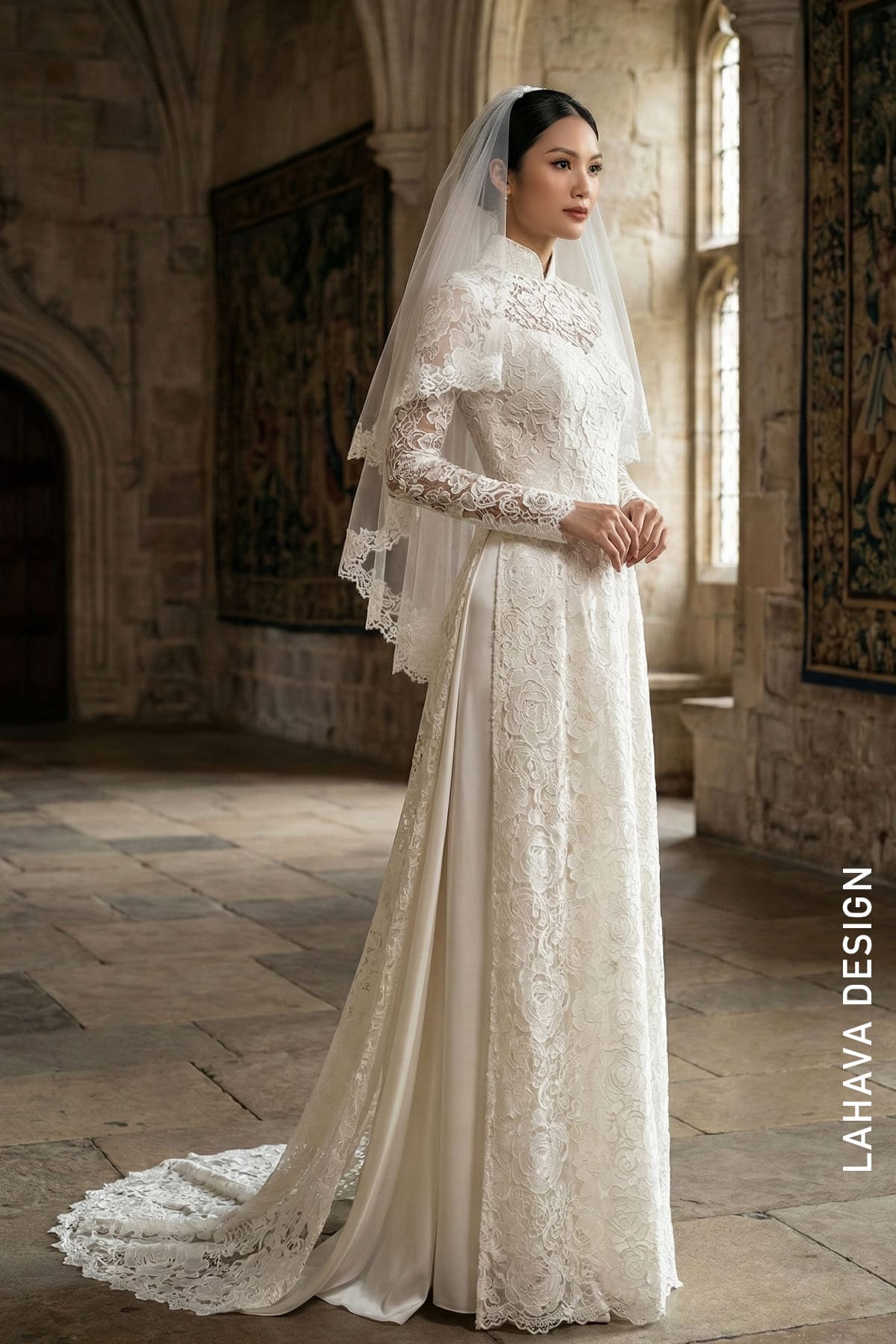 Chiếc áo dài cưới tuyệt đẹp này được làm từ chất liệu ren hoa trắng cao cấp, với thiết kế cổ cao truyền thống và tay dài. Tà áo dài thướt tha tạo vẻ đẹp thướt tha và sang trọng, đi kèm là chiếc lúp đội đầu viền ren tinh xảo, hoàn thiện vẻ ngoài cổ điển và trang nhã.