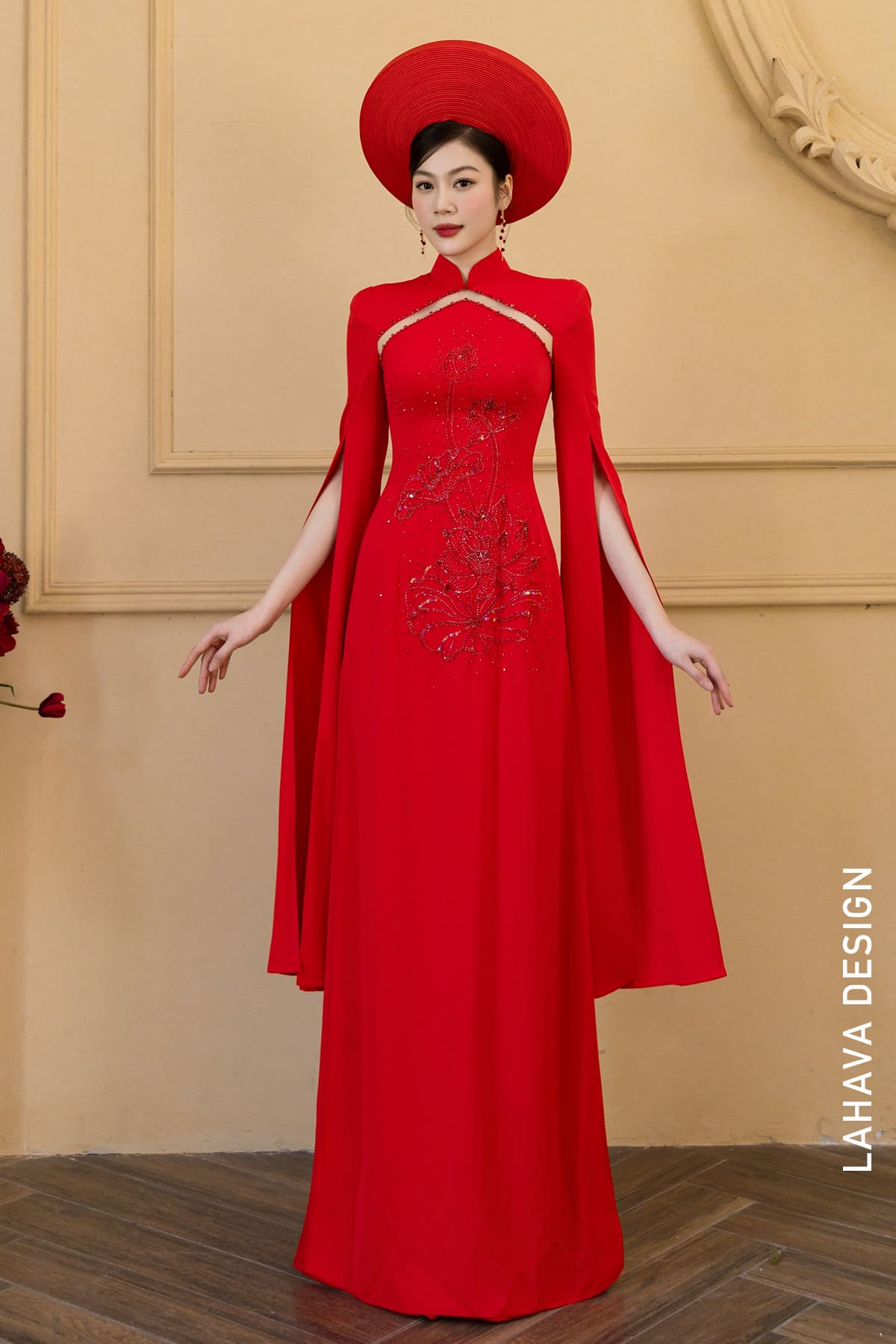 Mẫu áo dài cưới mang sắc đỏ rực rỡ, là sự giao thoa hoàn hảo giữa vẻ đẹp truyền thống và hơi thở hiện đại. Điểm nhấn độc đáo nằm ở phần cổ khoét cách điệu cùng thiết kế tà tay xẻ dài quý phái, tạo hiệu ứng thanh thoát trong từng bước đi. Trung tâm của chiếc áo là họa tiết hoa sen được đính kết thủ công tỉ mỉ, tượng trưng cho vẻ đẹp thanh cao và tinh khiết, giúp cô dâu tỏa sáng rạng ngời trong ngày trọng đại.
