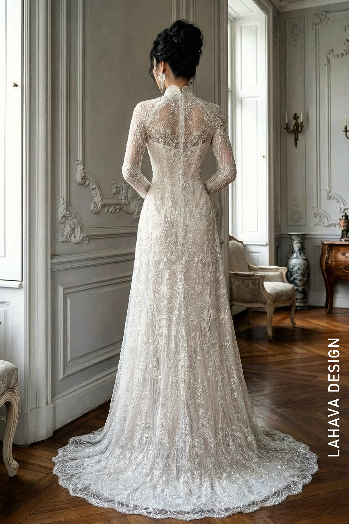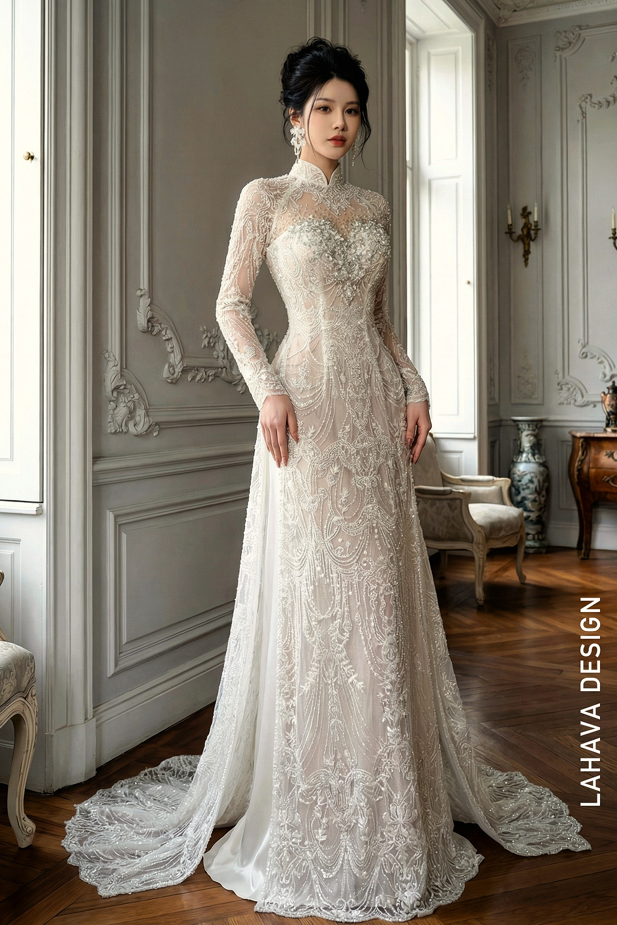 Mẫu áo dài cưới mang vẻ đẹp lộng lẫy với sự kết hợp hoàn hảo giữa phom dáng truyền thống và nghệ thuật đính kết hiện đại. Chiếc áo được chế tác trên nền chất liệu voan mỏng cao cấp, điểm xuyết tinh xảo bởi các họa tiết ren, đá pha lê và hạt cườm lấp lánh, giúp cô dâu toát lên vẻ quý phái và rạng rỡ trong ngày trọng đại.