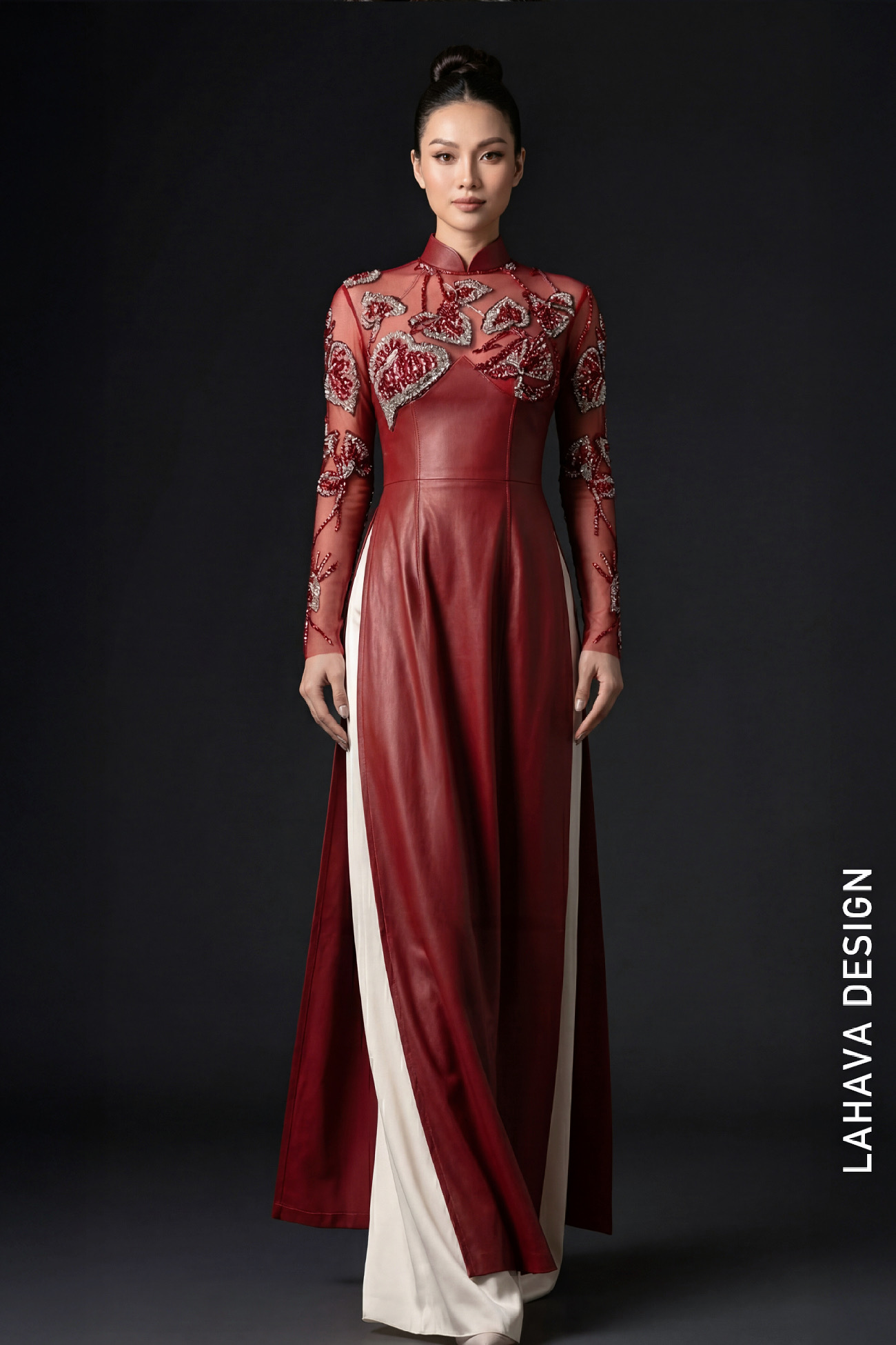 Một sự kết hợp táo bạo giữa nét đẹp truyền thống và hơi thở đương đại. Chiếc áo dài được chế tác trên chất liệu da cao cấp tông màu đỏ đô sang trọng, nổi bật với các họa tiết đính đá và cườm thủ công tinh xảo ở phần ngực và tay áo xuyên thấu. Thiết kế tôn vinh vóc dáng người phụ nữ, mang đến vẻ ngoài quyền lực nhưng vẫn đầy nữ tính.