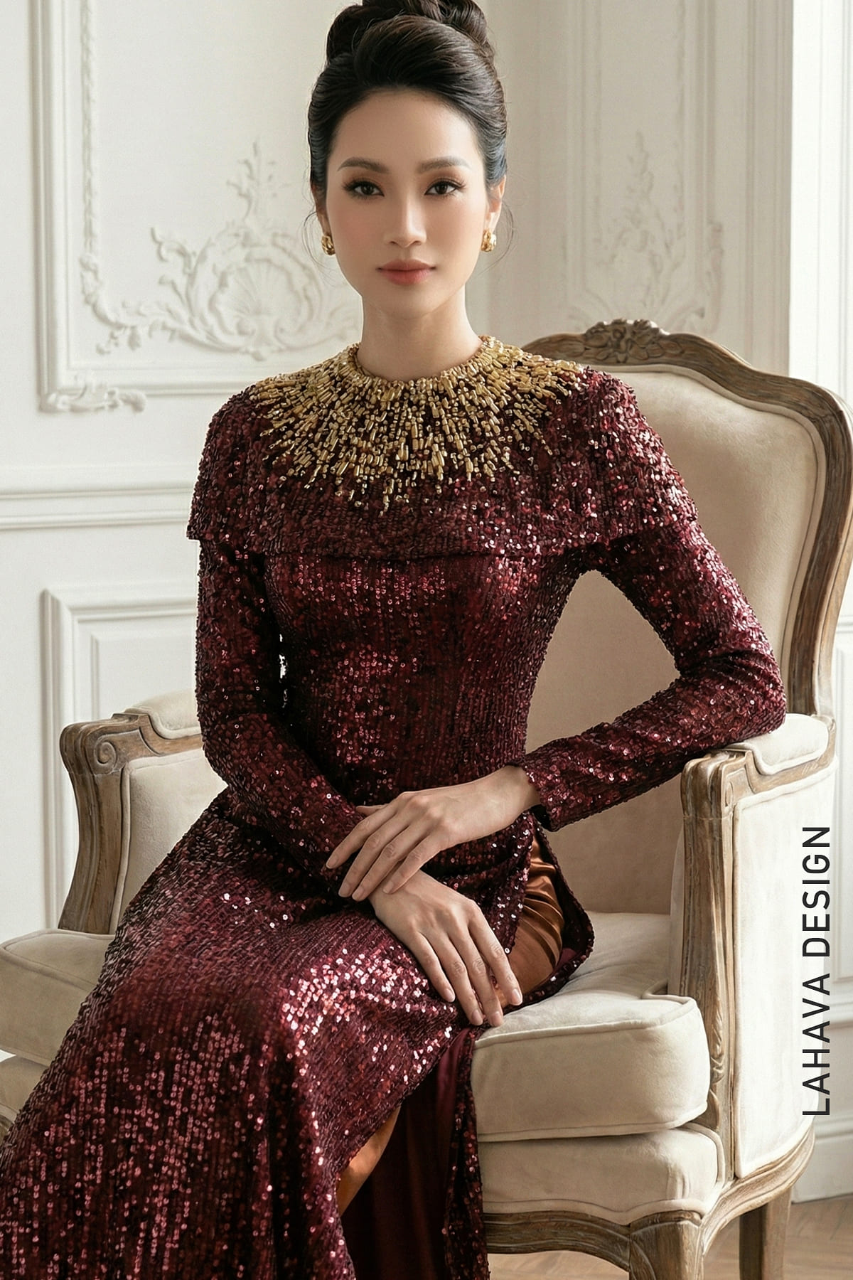 Nổi bật với tông màu đỏ đô (burgundy) trầm ấm và tôn da, chiếc áo dài được may trên nền vải kim sa cao cấp, tạo hiệu ứng lấp lánh theo từng chuyển động. Điểm nhấn đắt giá nằm ở phần cổ tròn được đính kết thủ công tỉ mỉ với đá pha lê và cườm vàng, tạo hiệu ứng như một chiếc vòng cổ trang sức lộng lẫy.