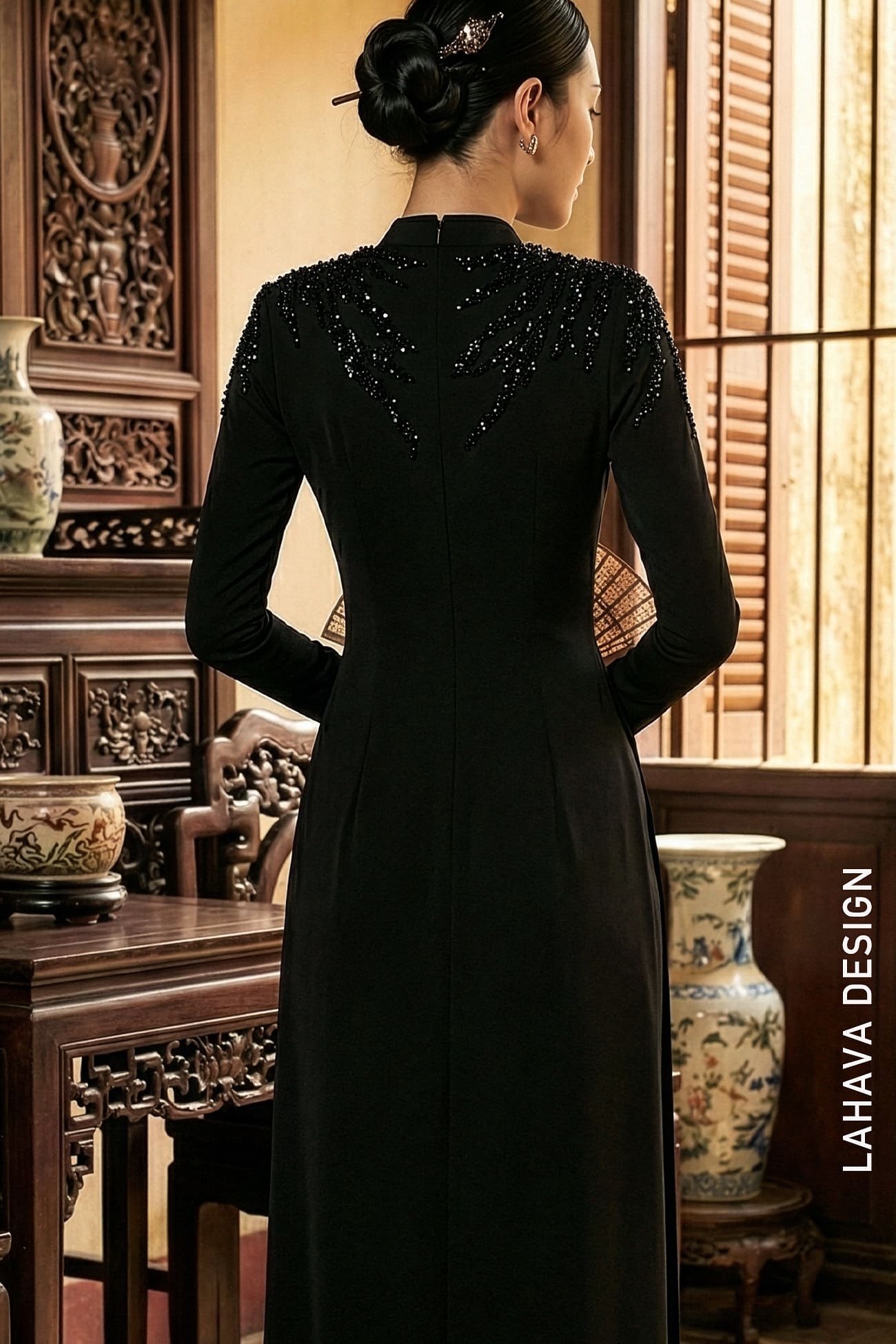 Thiết kế Áo dài từ LAHAVA mang sắc đen huyền bí, nổi bật với những dải cườm được đính kết thủ công tinh xảo dọc bờ vai. Sự kết hợp giữa phom dáng truyền thống và chi tiết đính kết hiện đại tạo nên một diện mạo quý phái, thanh lịch và đầy sức hút.