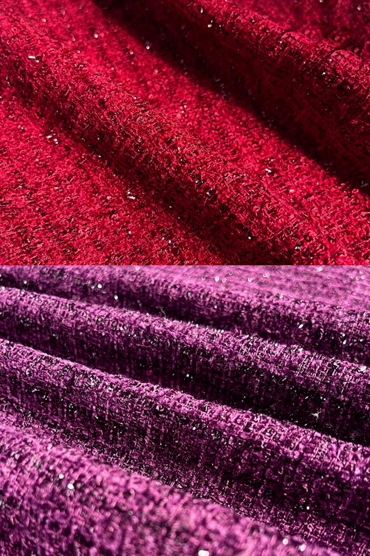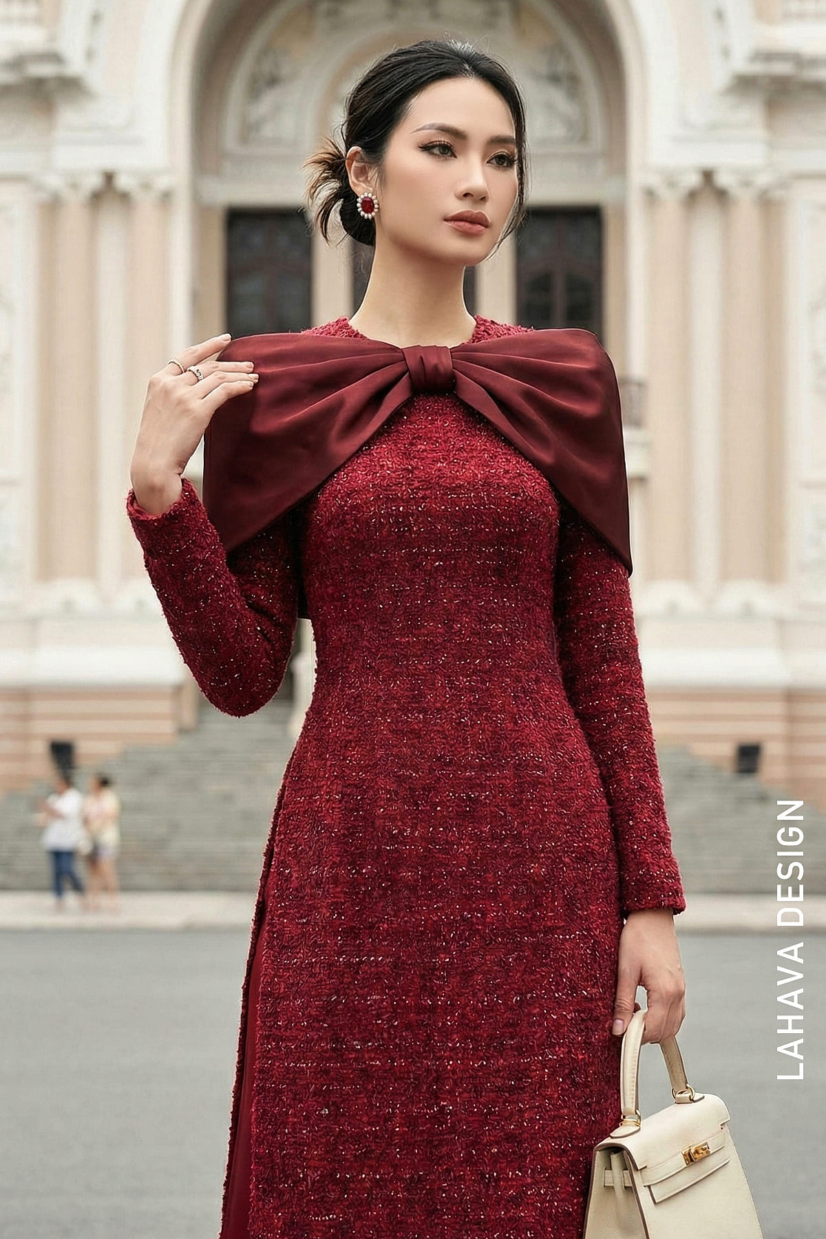 Một thiết kế áo dài cách tân đầy quyền lực và quý phái dành cho quý cô thanh lịch. Mẫu áo được may trên nền vải dạ tweed (tuyết mưa) có ánh kim cao cấp với tông màu đỏ đô trầm ấm, tôn da. Điểm nhấn đắt giá nhất chính là phần nơ lụa satin to bản được cách điệu như một chiếc khăn choàng vắt ngang vai, tạo nên vẻ đẹp kiêu sa và cổ điển. Kết hợp cùng quần lụa cùng tông màu, đây là lựa chọn hoàn hảo cho những sự kiện quan trọng hay các buổi tiệc sang trọng.
