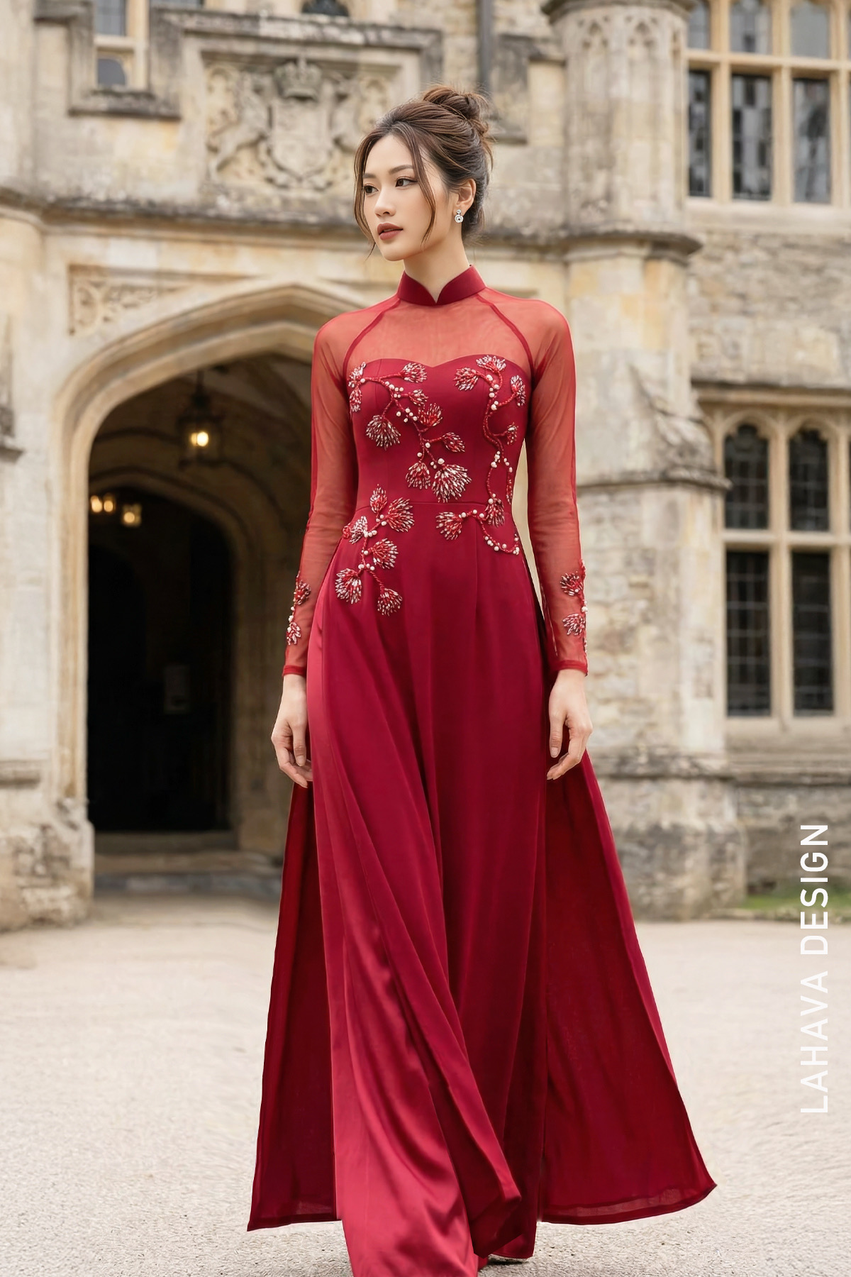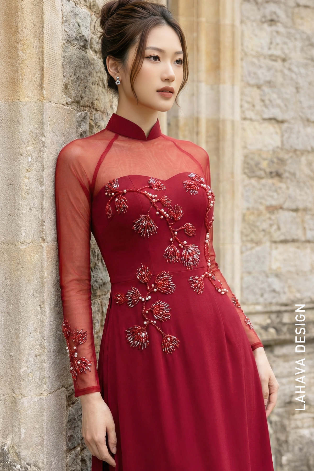 Sự kết hợp hoàn hảo giữa sắc đỏ rượu vang sang trọng và chất liệu lụa cao cấp. Điểm nhấn của thiết kế nằm ở phần cổ và tay áo bằng voan mỏng tinh tế, cùng những nhành hoa đính cườm nổi đính kết tỉ mỉ, tạo nên vẻ đẹp thanh lịch và cuốn hút cho người mặc.
