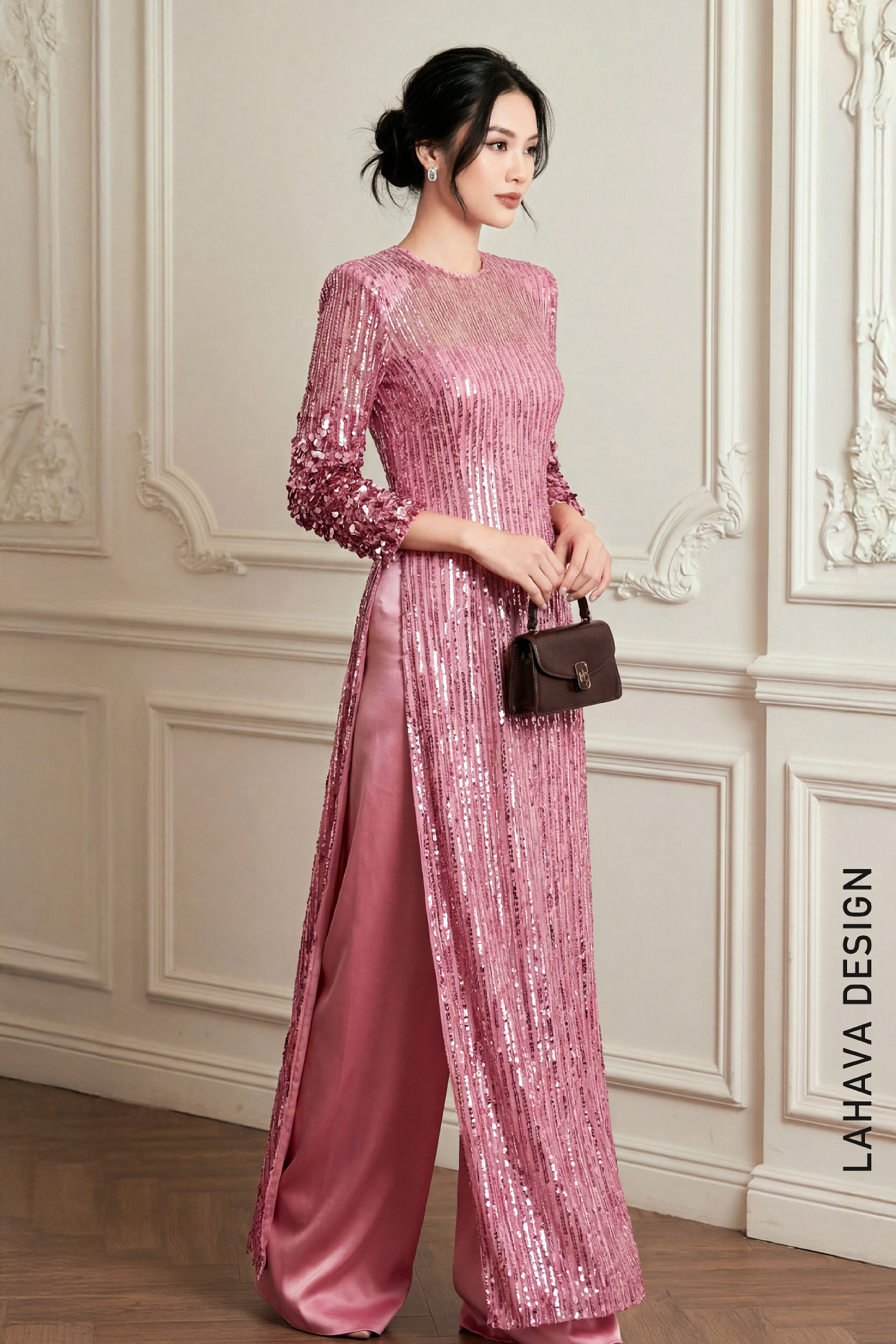 Chiếc áo dài là sự giao thoa hoàn hảo giữa nét đẹp truyền thống và hơi thở hiện đại. Thiết kế được phủ toàn bộ bằng lớp kim sa lấp lánh trên nền màu hồng rose thanh lịch, kết hợp cùng phần cổ xuyên thấu tinh tế tạo điểm nhấn quyến rũ. Đi kèm với quần ống rộng bằng lụa satin mềm mại, bộ trang phục mang đến diện mạo lộng lẫy, cực kỳ phù hợp cho các buổi dạ tiệc hoặc sự kiện đặc biệt.