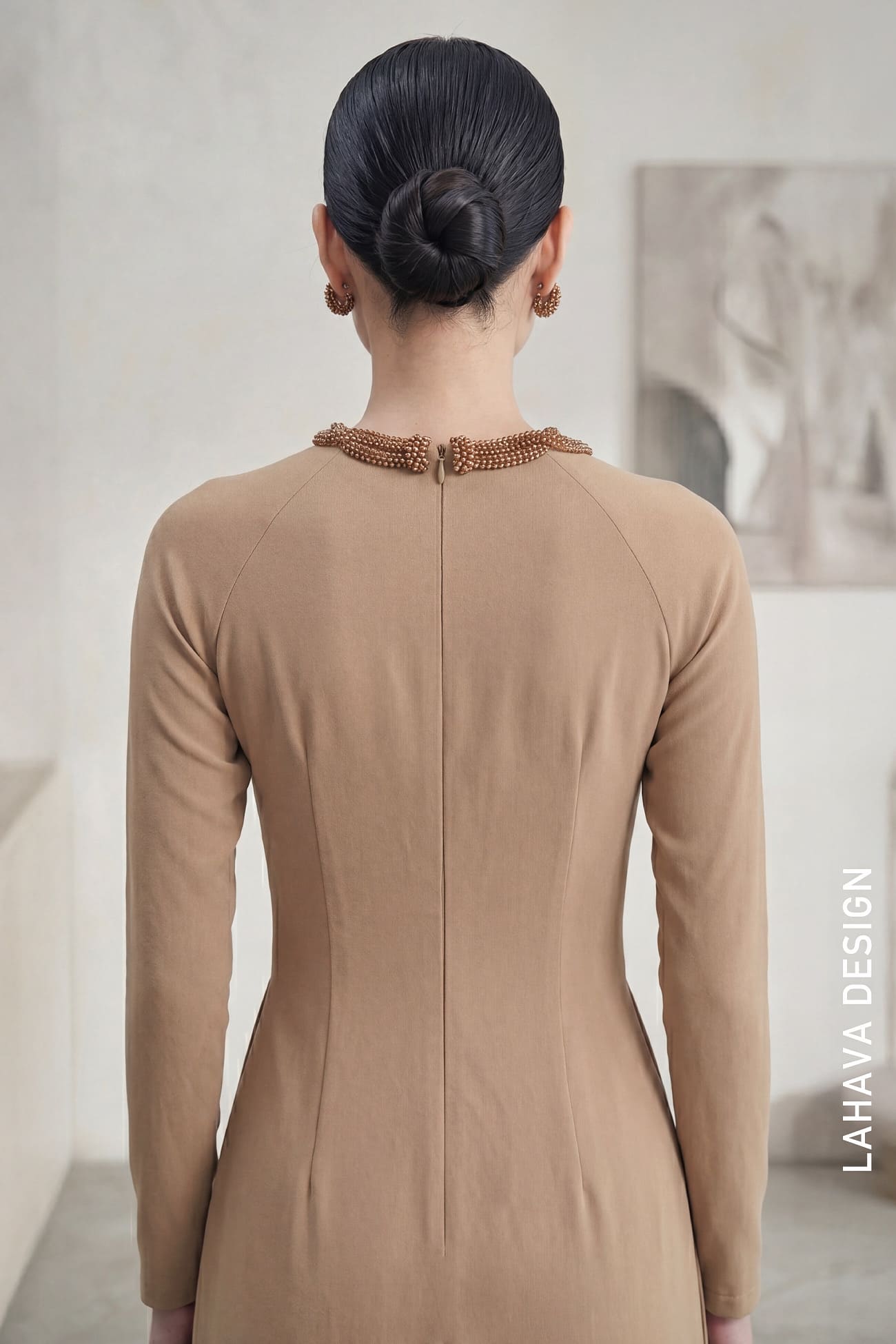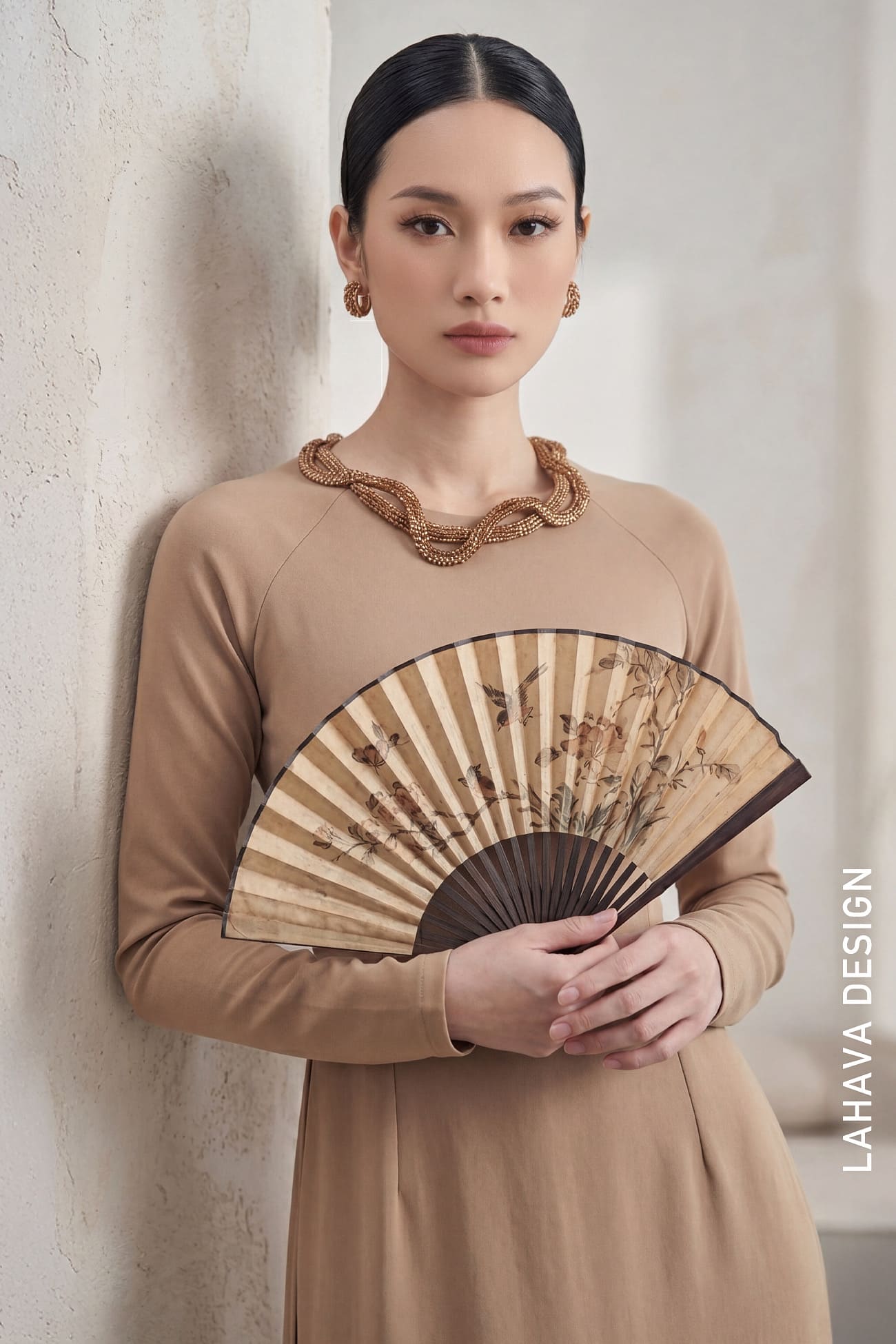 Một thiết kế tinh giản tối đa, tập trung vào đường cắt may sắc sảo trên nền vải màu be trung tính. Kết hợp với chiếc vòng cổ kim loại bện vàng và quạt vẽ tay cổ điển, chiếc áo dài này mang lại vẻ đẹp vừa sang trọng vừa mộc mạc, phù hợp cho những sự kiện quan trọng đòi hỏi sự thanh lịch đẳng cấp.