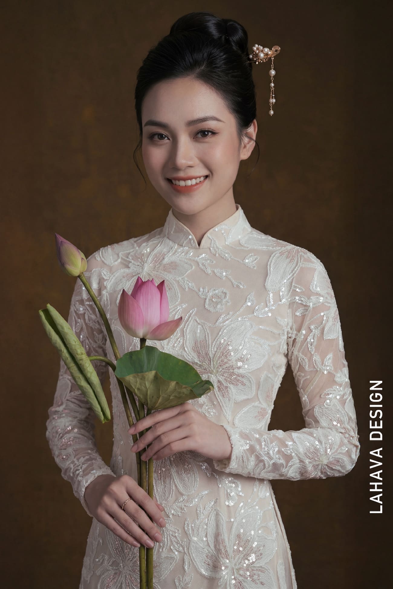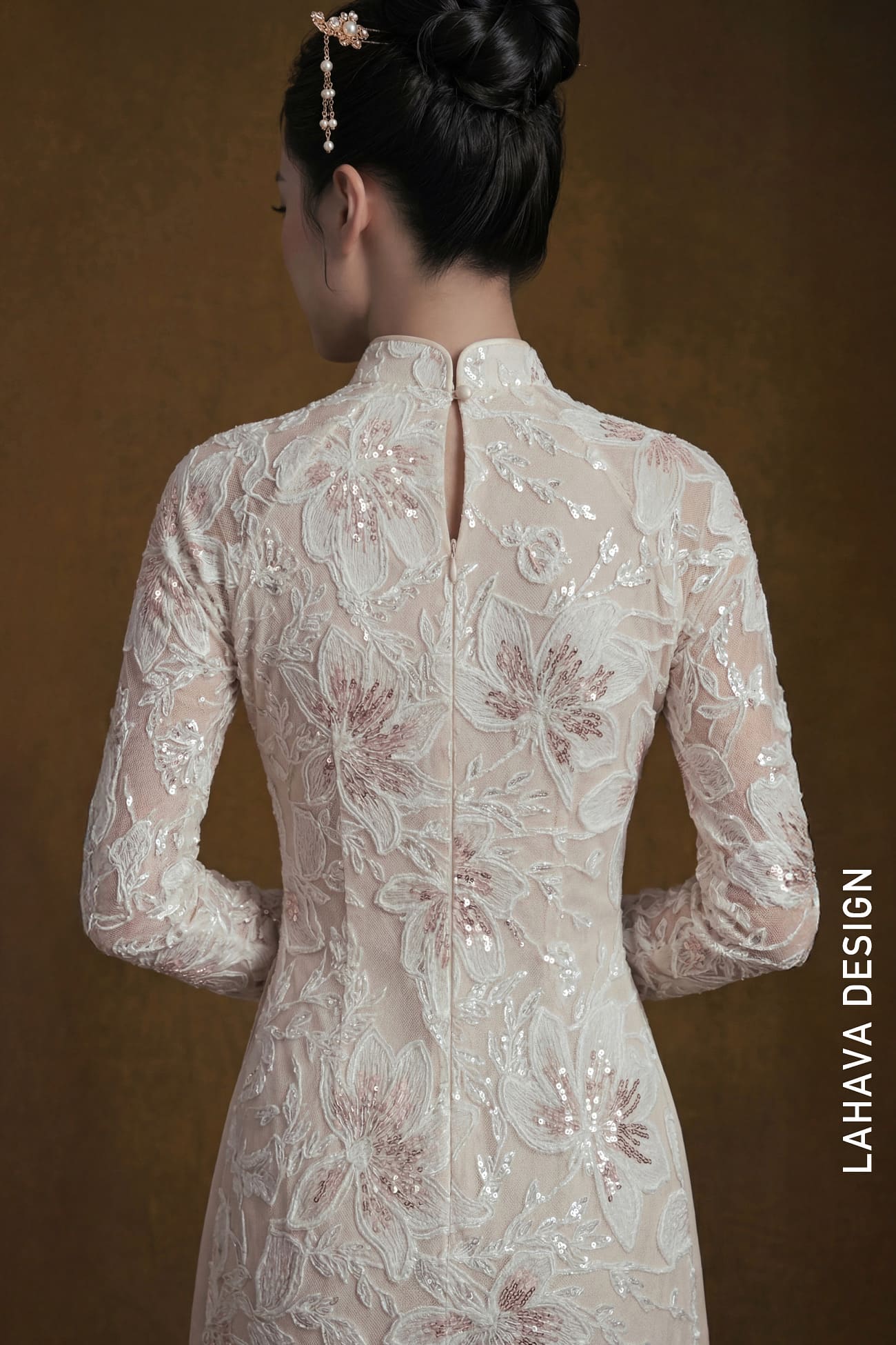 Là một tuyệt tác đương đại của thương hiệu LAHAVA DESIGN, chiếc Áo dài tuyệt đẹp này nổi bật với chiếc áo khoác ren màu ngà lấp lánh. Được tô điểm tỉ mỉ bằng các chi tiết thêu sequin hoa phức tạp với màu hồng phấn và trắng tinh tế, nó tạo ra một silhouette lấp lánh, cuốn hút. Cổ đứng truyền thống và tay dài được bổ sung tuyệt đẹp bởi các chi tiết lấp lánh. Kết hợp với quần lụa ống rộng màu be champagne thanh lịch và một chiếc trâm cài tóc tinh xảo có điểm nhấn ngọc trai, bộ trang phục này hiện thân của sự thanh lịch tinh tế và nét duyên dáng hiện đại. Bộ sản phẩm hoàn chỉnh với một chiếc quạt gỗ chạm khắc đẹp mắt.