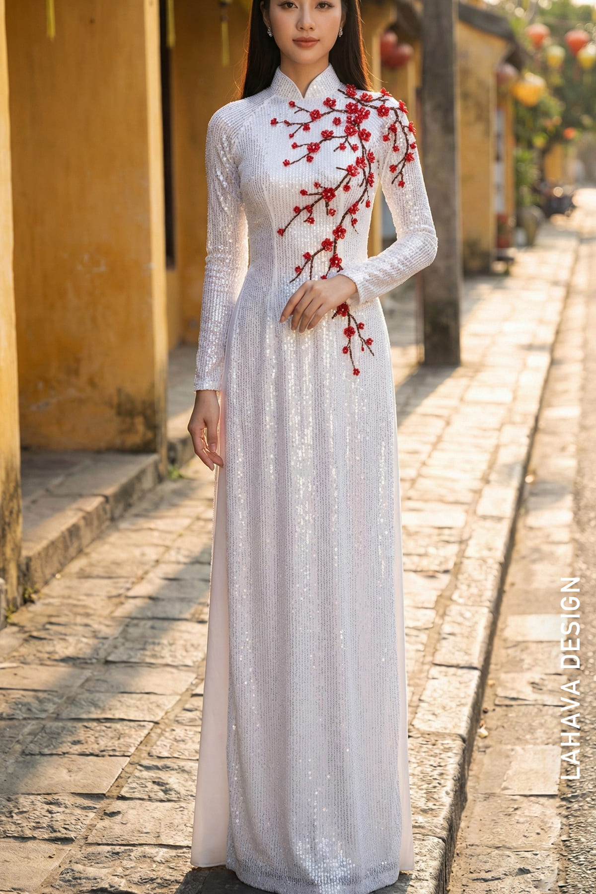 Mẫu áo dài tuyệt đẹp này được thiết kế trên nền vải kim sa trắng cao cấp, tạo hiệu ứng bắt sáng lấp lánh theo từng chuyển động. Điểm nhấn đắt giá là họa tiết nhành hoa đỏ được đính kết thủ công tỉ mỉ, trải dài mềm mại từ vai xuống eo, tạo nên sự tương phản nổi bật trên nền trắng tinh khôi. Một thiết kế hoàn hảo cho các dịp lễ Tết, đám cưới hoặc sự kiện dạ hội.