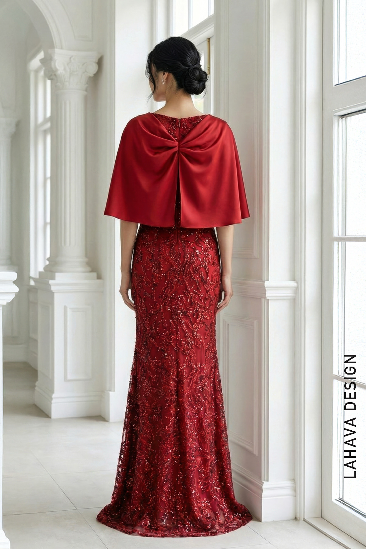 Thu hút mọi ánh nhìn với thiết kế dạ hội màu đỏ ruby đầy quyền lực và quý phái này. Chiếc đầm sở hữu phom dáng ôm nhẹ tôn đường cong, được đính kết tỉ mỉ với hàng ngàn viên đá và kim sa lấp lánh tạo nên những họa tiết hoa văn cầu kỳ. Điểm nhấn đắt giá nằm ở phần áo choàng vai (capelet) bằng lụa satin mềm mại, được xếp nếp và thắt nút cách điệu tinh tế, mang lại vẻ đẹp vừa cổ điển, vừa hiện đại. Đây là lựa chọn hoàn hảo cho các buổi tiệc tối sang trọng hay các sự kiện thảm đỏ.