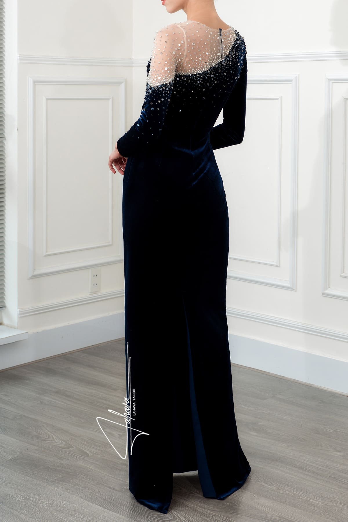 Mẫu đầm dạ hội nhung cao cấp với thiết kế dáng váy suông, xẻ sau. Áo cổ thuyền phối lưới xéo lạ mắt. Kết hạt cao cấp trên thân áo.