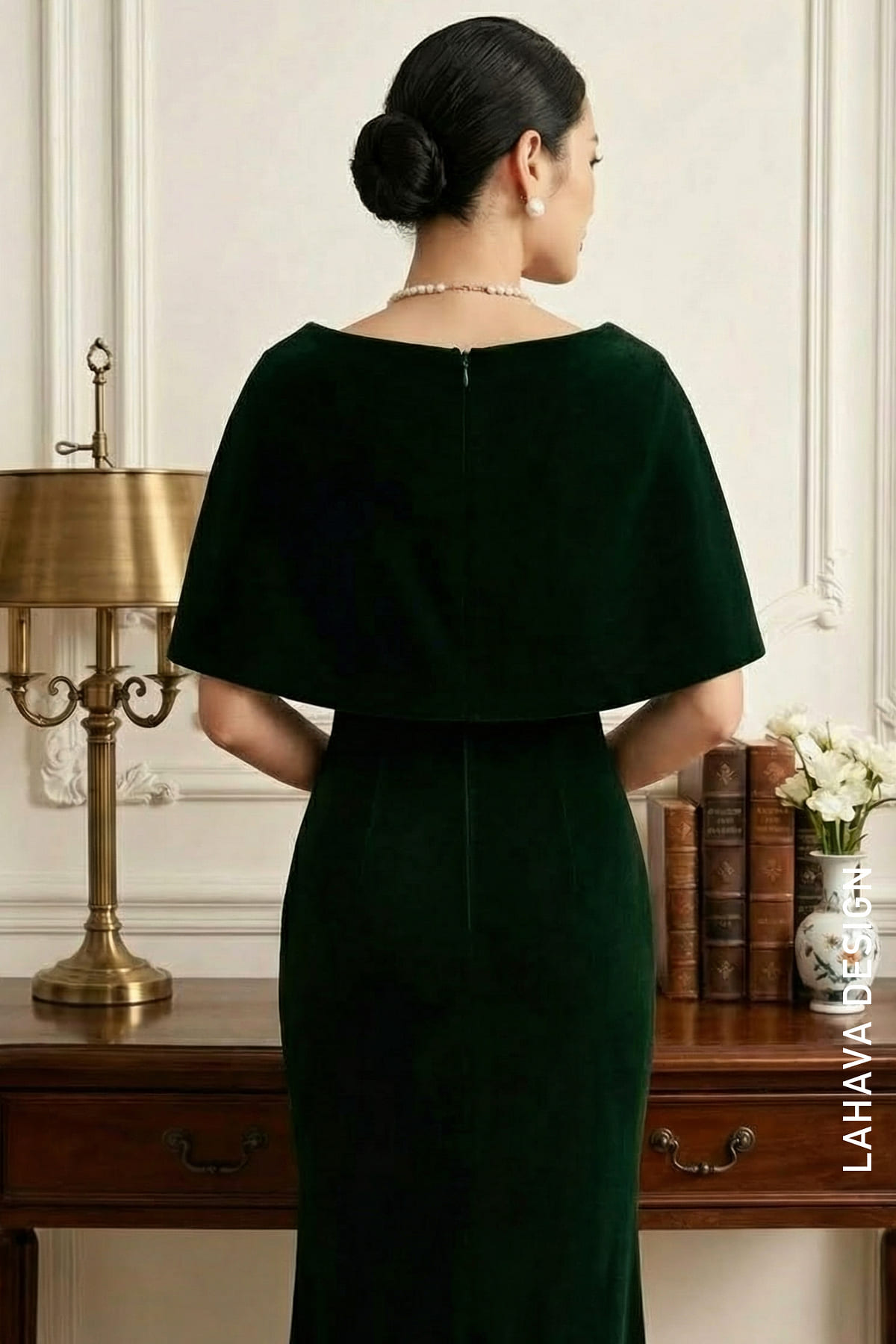 Chất liệu: Sử dụng vải nhung cao cấp với độ co giãn nhẹ, bề mặt mượt mà và bắt sáng tinh tế, giúp tôn lên vẻ đẹp đằm thắm. Tông màu xanh rêu đậm (emerald) giúp làn da thêm sáng và nổi bật.