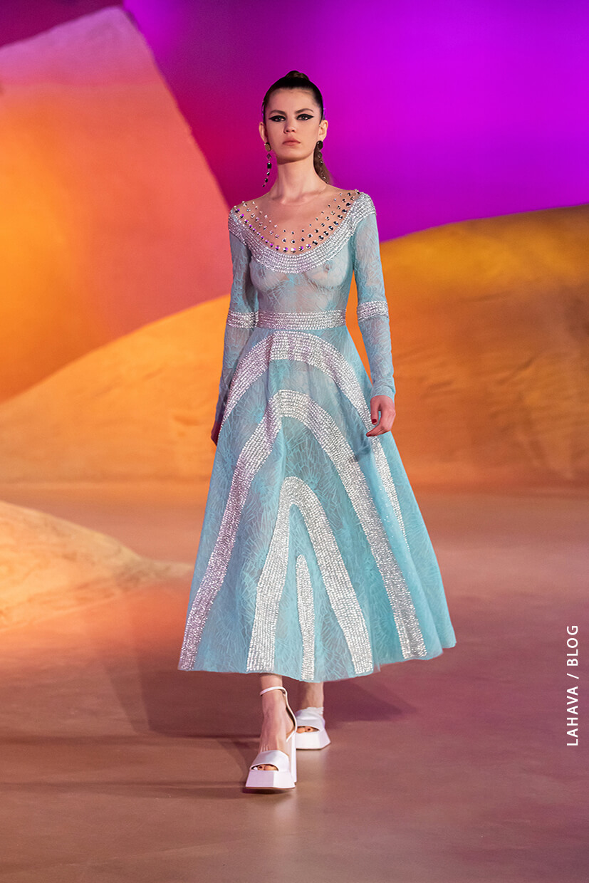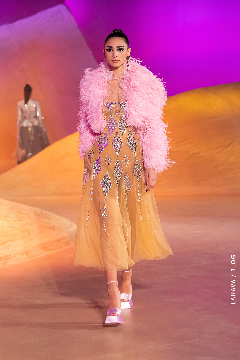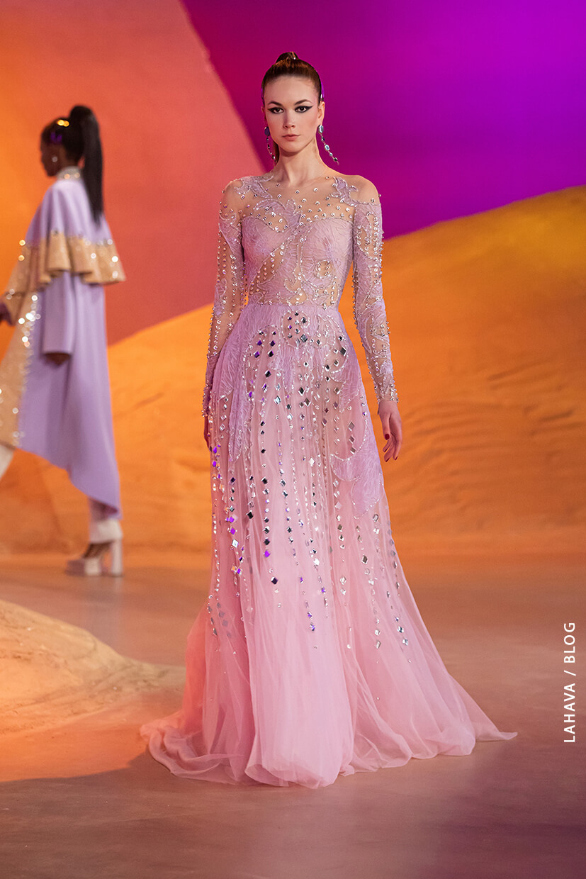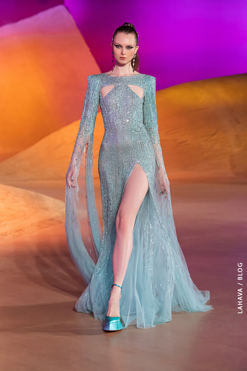 Một hình ảnh phát sáng, giống như hai thiên hà đang va vào nhau, bộ sưu tập Đầm dự tiệc Ready-to-wear Thu Đông 2022/23 của Georges Hobeika mang vẻ đẹp quyến rũ của thập niên 60 với những hình bóng của tương lai, tất cả các set đồ được trình diễn trên "Hành tinh đỏ".